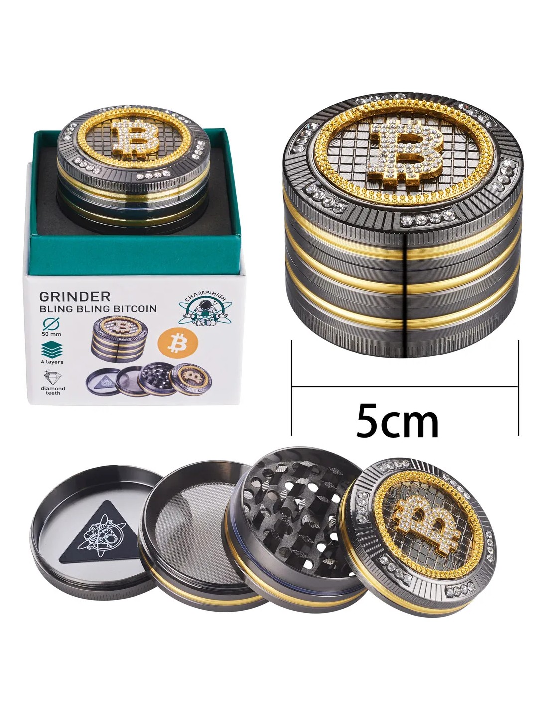 El grinder Bling Bling Bit Coin va a ser la envidia de todos tus colegas, ya que ha sido diseñado con todo lujo de detalles convirtiéndolo en un objeto muy preciado que destaca por su tono dorado y piedras de cristal incrustadas. Un diseño elegante y sofisticado que incorpora púas en la parte superior con forma de diamante. El grinder Bling Bling es magnético y de gran durabilidad, ya que está confeccionado en aluminio. Dispone de un tamiz y de una paleta recoge polen. El grinder Bling Bling Bit Coin es todo un regalazo con el que sorprender a tu amigo fumeta. Además viene con una caja individual perfecta para regalo. Producto: Dimensión (cm): 5.0 x 5.0 x 3.6 Peso (kg): 0.13 EAN: 3661075329747 Csu: Dimensión (cm): 7.2 x 7.4 x 5.5 Peso (kg): 0.176